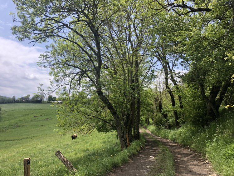 - De là débute une descente assez raide, d'abord entre pâtures puis dans les bois.